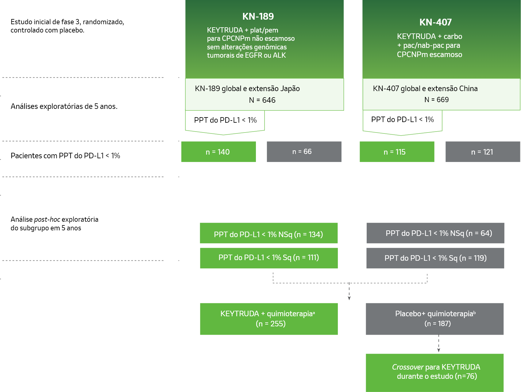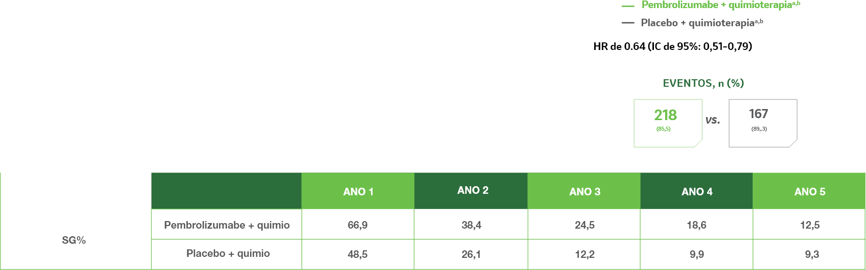 Novos dados exploratórios da análise de 5 anos dos estudos KEYNOTE-189 e KEYNOTE-407 em pacientes com CPCPNm com PPT do PD-L1 < 1% mostraram melhora significativa de sobrevida global, com HR de 0,64 (IC de 95%: 0,51–0,79) com KEYTRUDA® + quimioterapiaa,b em comparação com placebo + quimioterapia.1,a,b