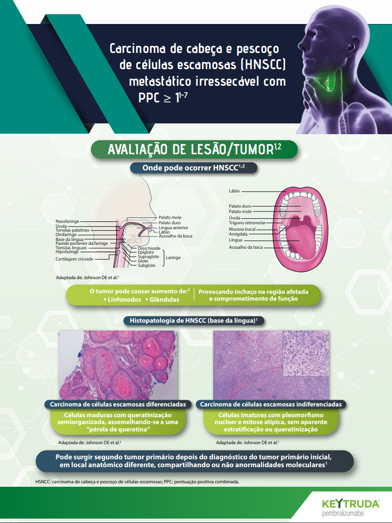Veja um infográfico com informações sobre onde pode ocorrer o HNSCC e ainda como o impacto na sobrevivência e na qualidade de vida dos pacientes pode estar relacionado com o conhecimento sobre as respostas do sistema imunológico.
