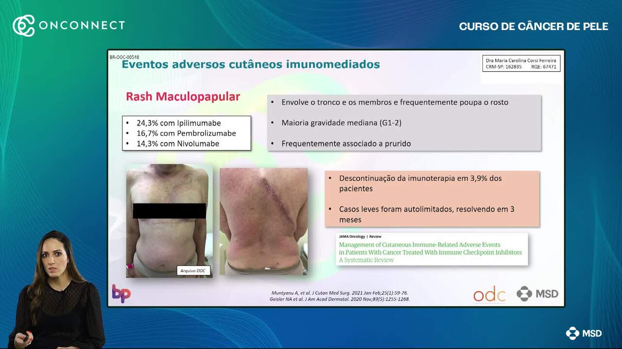 Os tratamentos sistêmicos no câncer de pele, especialmente imunoterapia e terapias-alvo, podem desencadear eventos adversos cutâneos relevantes. Reconhecer e manejar essas manifestações é essencial para o acompanhamento adequado do paciente oncológico. Nesta aula, a Dra. Maria Carolina Corsi aborda os principais efeitos dermatológicos e como o dermatologista pode atuar de forma integrada no cuidado multidisciplinar. Essa aula será muito importante para a sequência das próximas aulas! por isso não perca a aula 10: “Redução do risco do câncer de pele- da fotoproteção à quimioprevenção” com Dr. Elimar Gomes